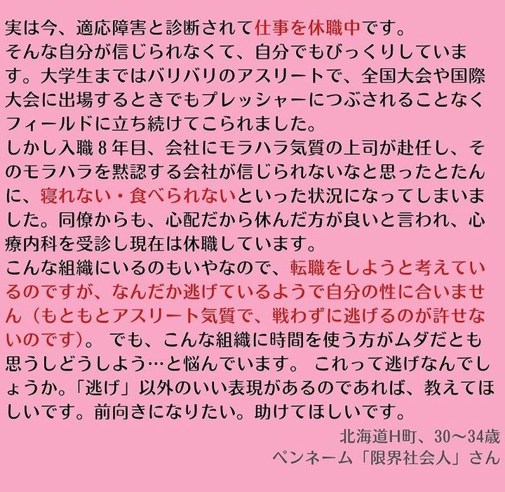 読者からのお悩み「現在休職中なんだけど、『アスリート気質』の自分は転職するのも逃げるようでいや…」
