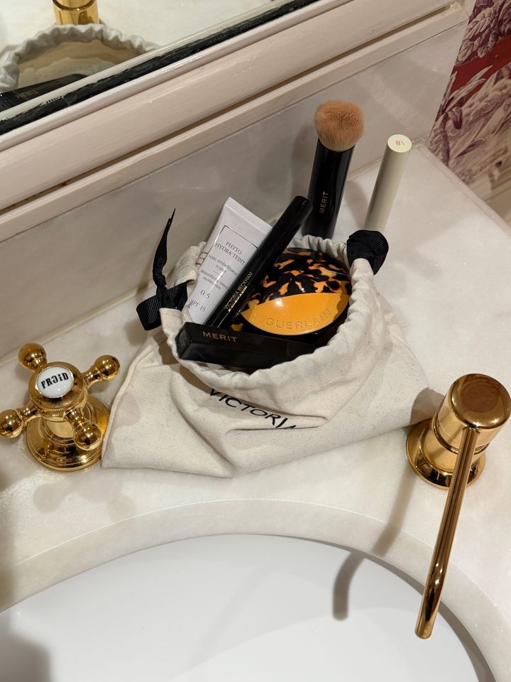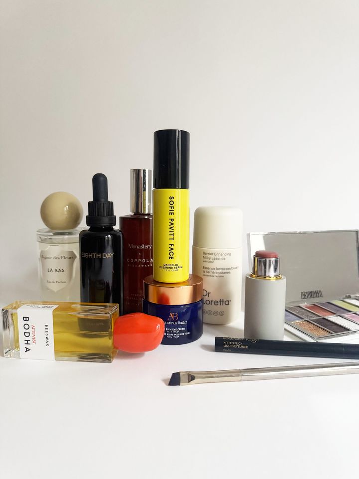 「メイクポーチのメインはメイクアップアーティスト、イサマヤ・フレンチのアイシャドウパレット。モダンで複雑な発色は唯一無二。『Westman Atelier』 のスティックチークは塗りやすく、顔がパッと明るくなります。スキンケアは化粧水のあと、『Sofie Pavitt』 の美容液と『アウグスティヌス・バーダー』のビタミンCセラムを使い分け。同アイクリームも愛用。個性を表現するための美容を追求しています」