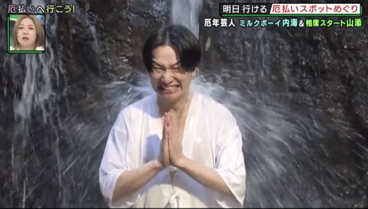 こちらでできる厄除けの重要な修行が、滝に打たれながら心身を清める「滝行」で…。「嘘でしょ!?」「もう嫌だ!」と抵抗を試みるもここで逃げ出すわけにもいかず、内海と一緒に修業に臨むはめになった山添! 水温はわずか5度、極寒の中で本厄芸人が挑む本気の滝行の結末は?