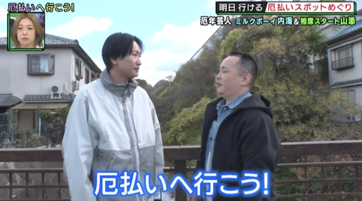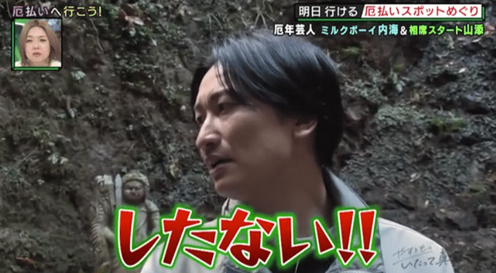 山添は芸歴では内海の4年後輩にあたるが、昭和60年生まれの同い年。しかし、厄年の風習をあまり信じていないらしく、「何で僕となんすか?」とまったく気が乗らないよう。本厄にビビりまくり、何としても厄払いに行きたい内海との間にはクッキリと温度差が…。そんなしっくりこない2人が向かったのは、全国から多くの修行者が訪れるという由緒あるお寺。