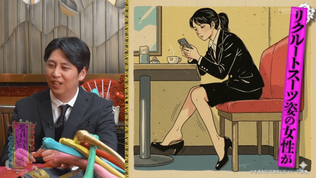 パンサー菅良太郎が切り出した「僕だけかもしれない」あるあるは、「リクルートスーツ姿の女性が、喫茶店とかで休んでいるときにパンプスのかかとだけ脱いでプラプラしているとき…」「これ、異常に可愛くないですか?」という意見。ニューヨーク屋敷、永野、ツートライブの周平魂はそろって「分かるわ~」と同意。永野は「リクルート姿の女性と僕ら芸人って、少し住んでいる世界が違う気がするから、あっちの世界へのあこがれがありませんか?」とさらに同意を求める。すると、今後はスリムクラブ・真栄田が「しゃぶらせてもらっていいですか?」と切り込んだ。