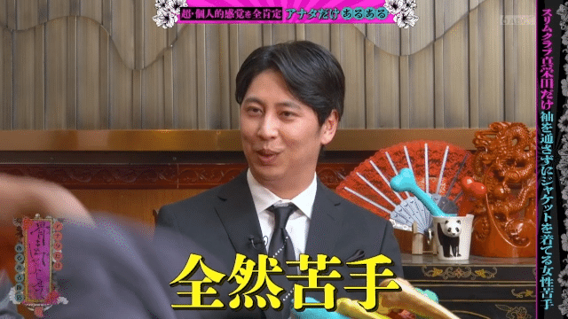 真栄田は「ジャケットに袖を通さずに肩から羽織っている女の人いるじゃないですか?」「あれ苦手です」と告白。寒い時などに革ジャンなどを肩から羽織る女性は「会議とかでも必要があって突っかかってくるんじゃなくて、突っかかりたくて突っかかってきそう」に見えるのだとか。その意見に屋敷も「俺もぜんぜん苦手です」と同意する。