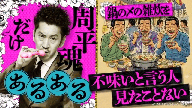 「鍋の〆(しめ)」についても周平魂は「僕だけかもしれないですけど……」と話を発展させる。周平魂いわく、「鍋の〆の雑炊をまずいっていう人を見たことが無い」「サイコパスとか相当ヤバい犯罪者でも言わないと思う」のだそう。今日はイマイチやなぁと思っている人や絶対にその前に食べた肉やカニの方がおいしいのに、〆の雑炊を食べた瞬間にみんながせーので「うま~」という空気感は確かにある、とのこと。