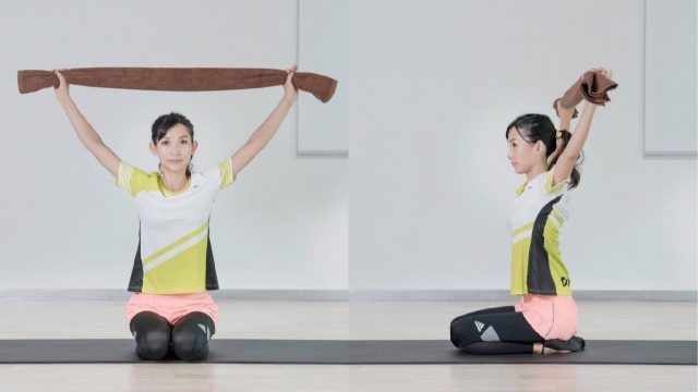 (1)肩幅より広めにバスタオルを持って両腕を上げる