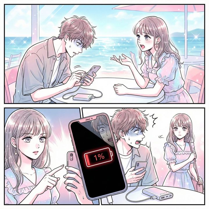 でも、私は気づいてしまったのです。彼のスマホから伸びるケーブルの先、テーブルに置かれたモバイルバッテリーのランプが、もう一つも点灯していないことに。