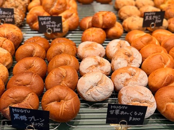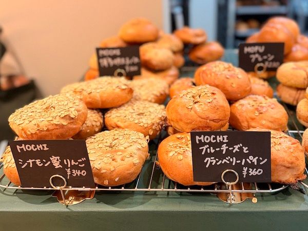 シナモン蜜りんご、ブルーチーズとクランベリーパイン、、、どれもとっても美味しそう♪ 値札をよくみると、左上にMUGYUとかMOCHIとか書いてあります。これは、それぞれ違った食感を楽しんでもらうための工夫だそうです。MUGYUは、ニューヨークベーグルのような硬めの噛みごたえ、MOCHIはその名の通りモチモチとした食感、そしてもうひとつ、MOFUはパンのような柔らかめの食感になっているそうです!
