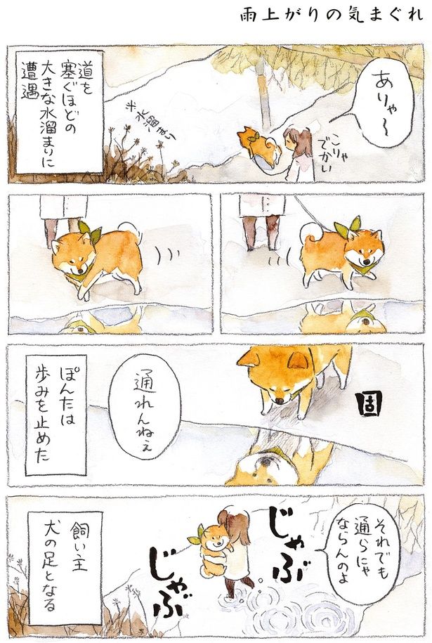 大きな水たまりを前に固まる柴犬。はしっこにある水たまりは避ければいいのに…/柴犬ぽんちゃん、今日もわが道を行く2