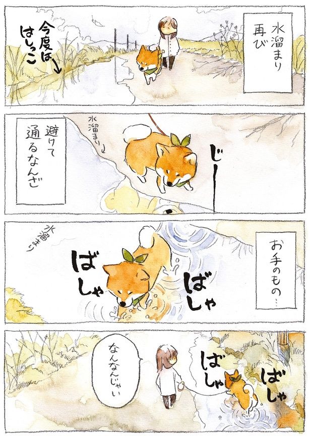 3. 大きな水たまりを前に固まる柴犬。はしっこにある水たまりは避ければいいのに…/柴犬ぽんちゃん、今日もわが道を行く2