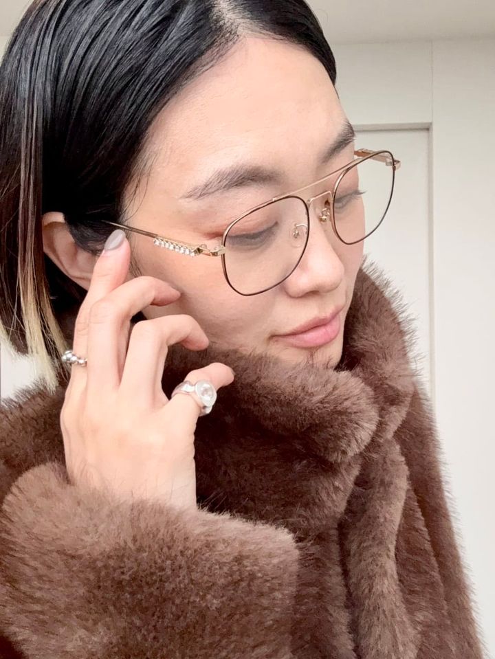 「Heyepのゴールドフレームのメガネは、サイドにあしらわれたストーンがとても可愛くて上品。かけるだけでコーデ全体が引き締まり、存在感のあるスタイリングに仕上げてくれるので、つい手に取ってしまうお気に入りアイテムです」アイウェア¥17,600(heyep)