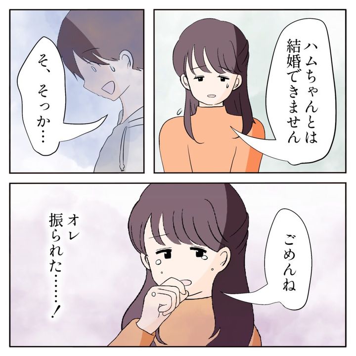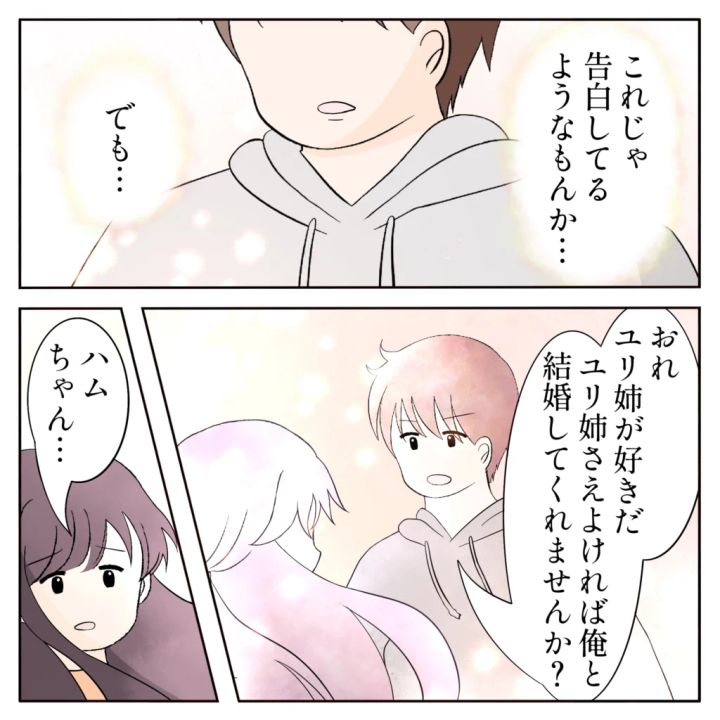 ユリ姉は申し訳なさそうに俯いて「ハムちゃんとは結婚できません。」と言った。好きだって言ってくれたのになんで?「そ、そっか・・・」と無理やり笑顔を作ったけど、ショックを隠せていたかどうかは自信がない。「ごめんね」とユリ姉は涙をこぼしていった。俺、振られた。