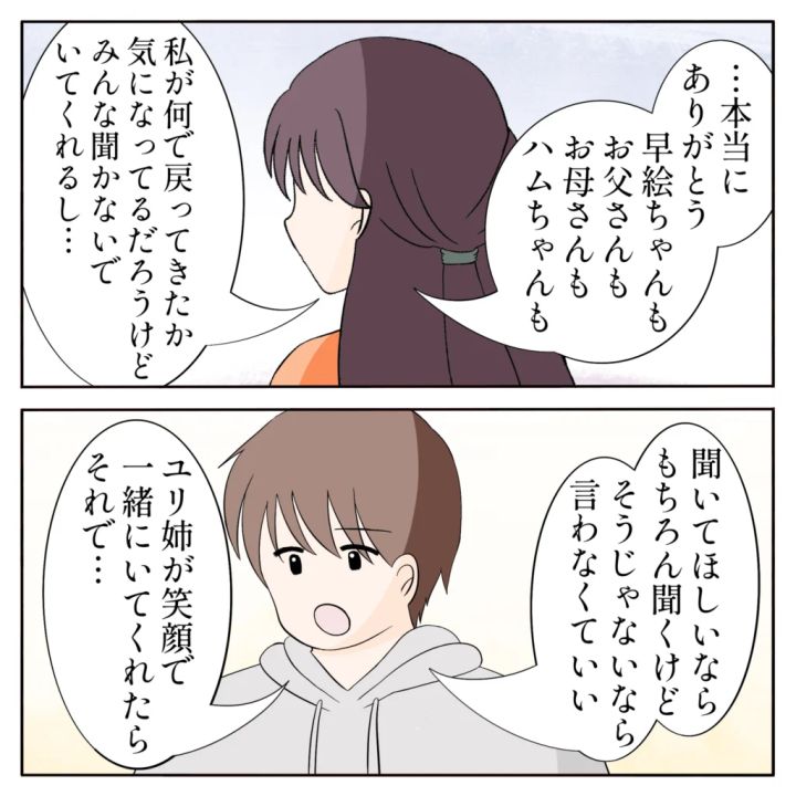 しばらくするとユリ姉の顔からふっと笑顔が消えて、「本当にありがとう」と真剣な顔をして言った。ユリ姉にとって、結婚したユリ姉がどうして地元に戻ってきたのか、何も聞かれないことが居心地が良かったみたいだ。「聞いてほしいならもちろん聞くけど、そうじゃないなら言わなくていい。ユリ姉が笑顔で一緒にいてくれたらそれで・・・」と、俺たち家族みんなの気持ちを・・・いや、俺の気持ちを伝えた。