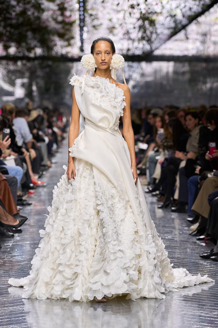 彫刻的な球体フォルムを描くビスチェドレスや、花弁を重ねたようなカスケードフリルのドレスも登場する。ケニア出身の陶芸家マグダレン・オドゥンドの造形作品から着想を得た有機的なシルエットは、大胆で、ときに型破りなボリュームとして表出し、それらはアトリエで仕立てられたというより、庭から自然に芽吹いたかのよう。アンダーソンのまなざしのもと、花々は力強く、芸術的なかたちで、クチュールドレスとして新たな生命を与えられている。