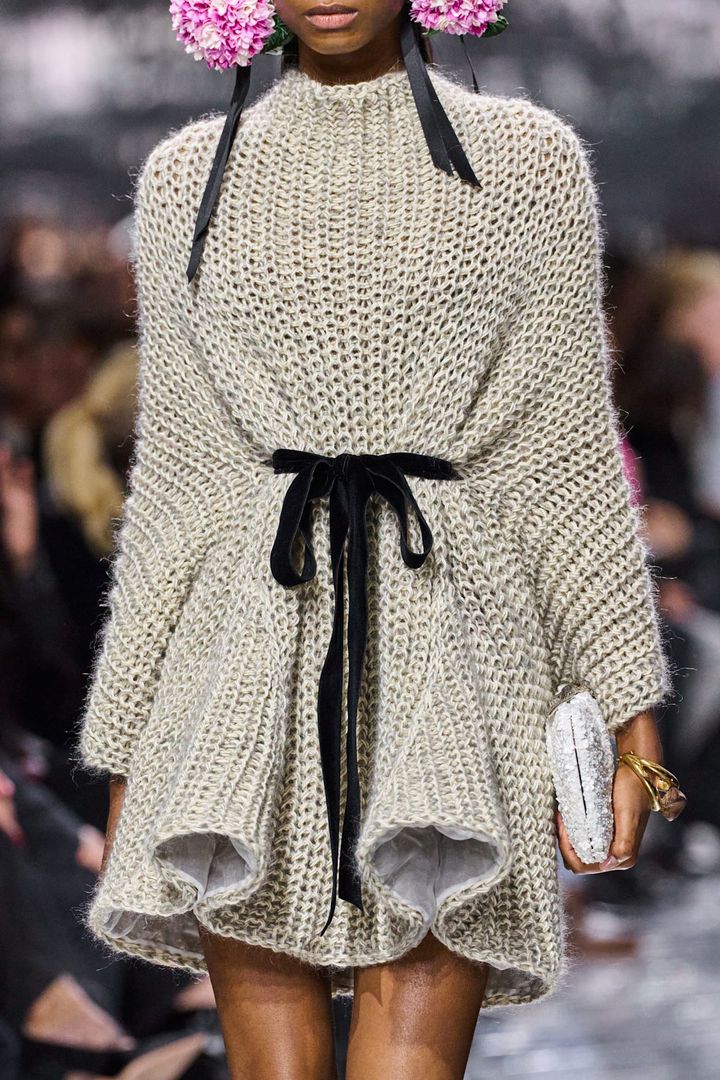 しかし、伝統を踏襲するだけの優等生に終わらないアンダーソンは、反逆的な身ぶりとして、ニットを新たな表現言語に据えた。構築性と装飾性が重視されてきたオートクチュールにおいて、ニットは長らく周縁的な存在にとどまってきたが、ここではその位置づけが大きく更新されている。カシミヤ製のケープ風のアシンメトリーなトップスや、シルクとウールで編まれたケーブルニットセーターといった“ドレスダウン”の提案にとどまらず、バブルのように膨らむ前衛的なフォルムや、身体の動きに寄り添う流動的なミニドレスまでもが、テクニカルニットによって構成されている。