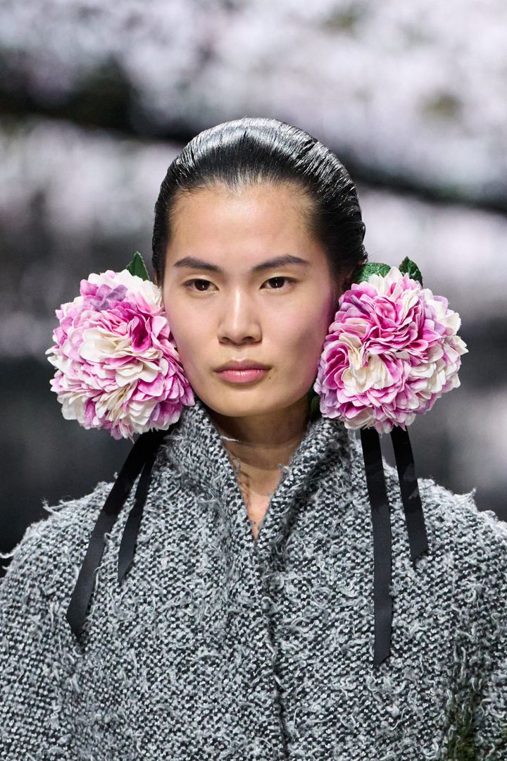 会場装飾だけでなく、コレクションにも自然の要素が至るところに存在する。モデルの腕には、長い草のように見える鮮やかなグリーンの断片が載せられ、耳元からはシルクで切り出されたシクラメンの花束が揺れていた。豊潤なイヤリングというジュエリーとして、またドレスやスカートに総柄や花壇のような配置で描かれ、手刺しゅうによって咲き乱れる花々。