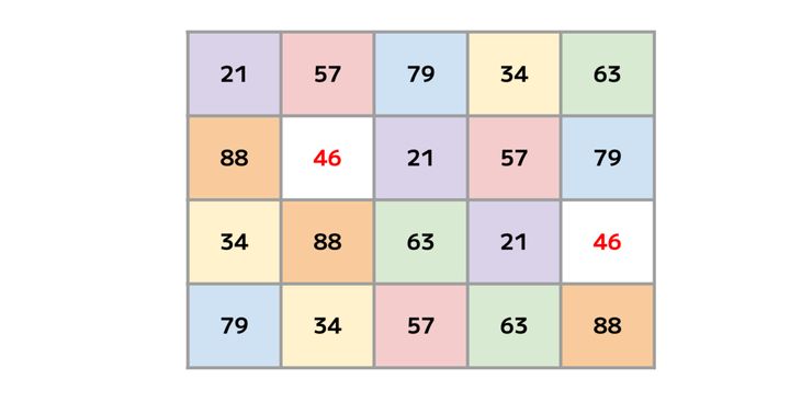 【脳トレ】5×4の表に書かれた7種の数字「21・34・46・57・63・79・88」。1種だけ2つしかない!?その数字はどれだ??