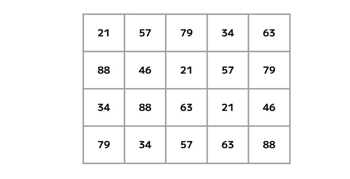 画像の表は横5マス、縦4マス。 そこに「21・34・46・57・63・79・88」という7種の数字が配置されています。