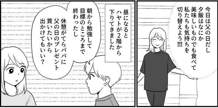 警察が来た翌週は父の日でした。私が起きると、すでにハヤトは起きていて、部屋で勉強をしていました。もしかしたら、一連のできごとからハヤトもいろいろ思うところがあって、気持ちを入れ替えようと思ったのかもしれない。朝から必死に机に向かうハヤトを見て、私はそう思い、嬉しくなりました。