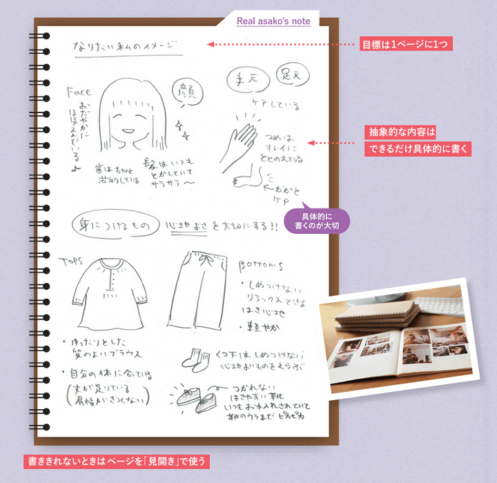 とくに髪型や着こなしといった見た目の理想を書き出すときは、イラストを描く代わりに、写真や雑誌の記事を切り抜いて貼りつけるのもおすすめ。自分の理想像が現実のものとしてイメージしやすくなります。