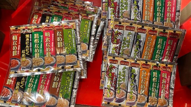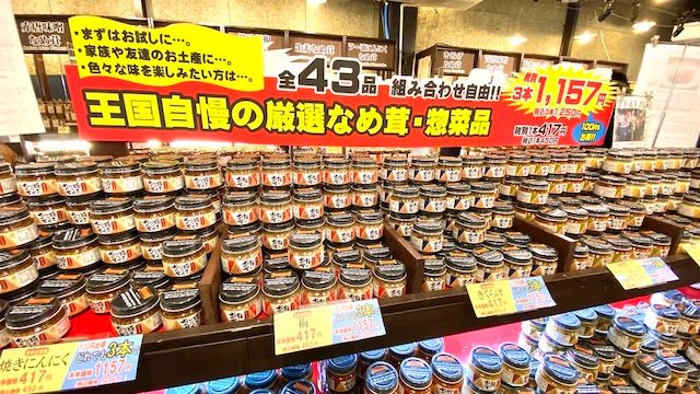 こちらは王国人気No.1、大人気なめ茸シリーズ。ベーシックな醤油漬けからあっさりした梅なめ茸、蟹をふんだんに使った贅沢ななめ茸も。スタッフさんにうかがったところ、特に人気なのが「明太なめ茸」。変わり種でおすすめは「クリームチーズなめ茸」。新作のおすすめが「牛すきなめ茸」だそうです!