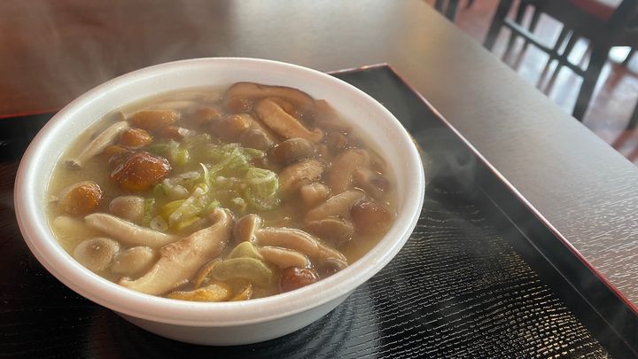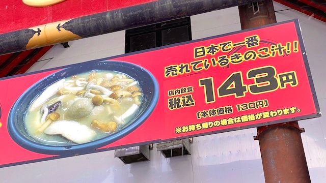 というわけで送迎の復路で、待望のきのこ王国に入国することになりました。年間約30万食の売れ行きを誇るきのこ汁は、なんと1杯税込143円です! この物価高の時代に!