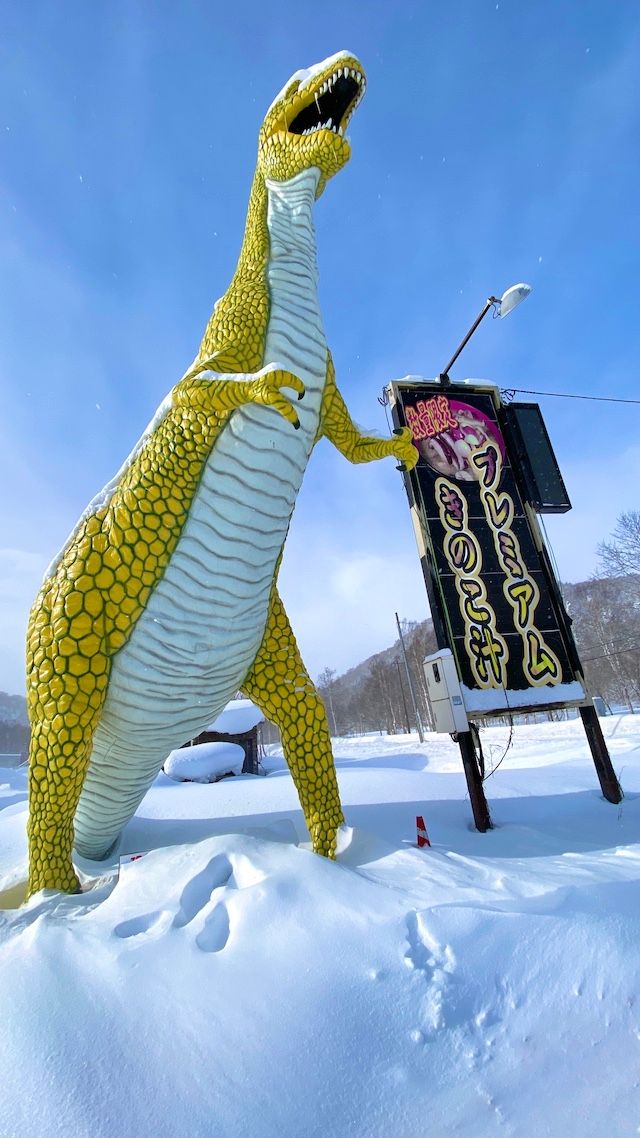 そしてなぜか看板の横では巨大な黄色い恐竜が出迎えてくれます。なぜ恐竜? と疑問が湧きますが、公式SNSでも「なぜ恐竜が出迎えるのかは聞かないでください」とあり、深く考えずこの光景を面白がるのが通な楽しみ方。