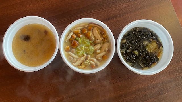 左から「大滝名物きのこ汁」税込143円/「プレミアムきのこ汁」税込280円/「のりなめこ汁」税込183円
