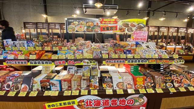 きのこ王国厳選の北海道ラーメン(袋麺)やご当地カレー(レトルト)、北海道銘菓などの定番土産も