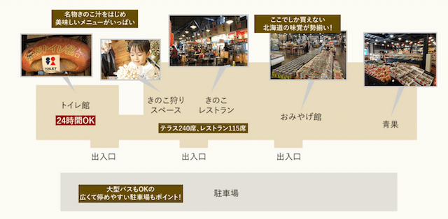 「きのこ王国」建物マップ:トイレ館・きのこ狩りスペース・きのこレストラン・おみやげ館・青果などのスペースに分かれている きのこ王国公式サイトより