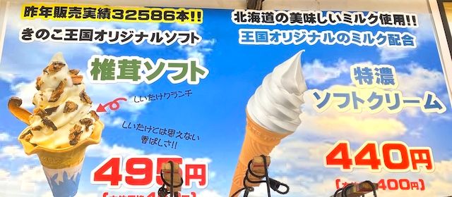 きのこ王国オリジナルのソフトクリーム「椎茸ソフト」税込495円は昨年販売実績32,586本