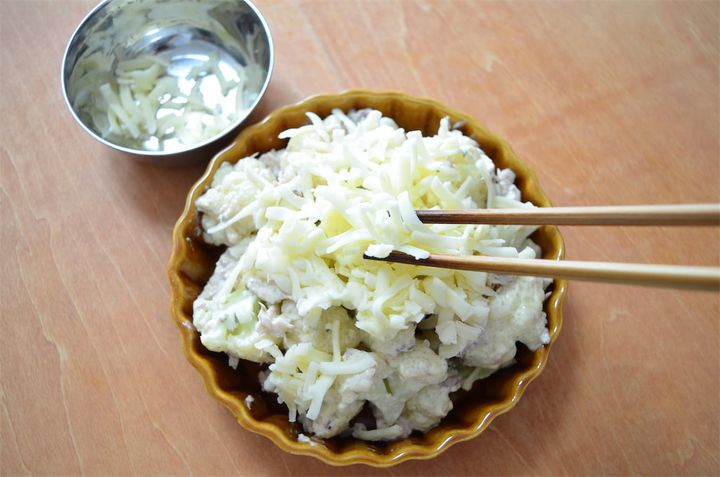 4. 耐熱容器に具材を入れて、その上にピザ用チーズをのせる。