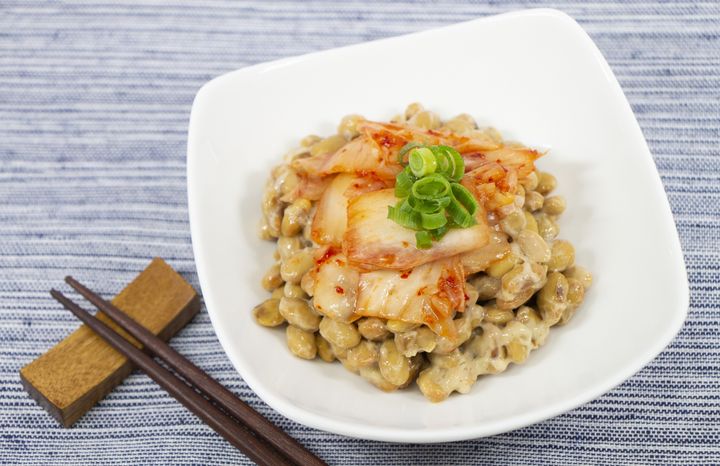発酵食品同士の最強コンビ。キムチのピリッとした辛さと酸味が、納豆のまろやかさと混ざり合い、ダブルの整腸パワーが期待できます。