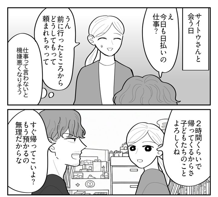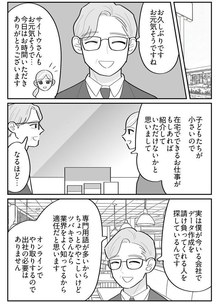 私はツバキ。夫ダイスケとは授かり婚でした。長女のシュリ(1歳)を出産し、その後すぐに次女のリセ(0歳)も授かりました。可愛い子どもたちと過ごす毎日はとても幸せです。しかし専業主婦の私は、毎月ギリギリの家計に不安が募ります。焦った私は元上司のサイトウさんに連絡すると、在宅の仕事を紹介できそうだという返事をもらうことができました。私は週末、ダイスケに子どもたちをお願いしてサイトウさんの話を聞きに行くことにしたのです。