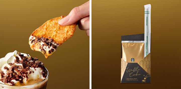 別添えのワッフルクッキーを“ディップ”すれば、香ばしいワッフルクッキーの食感が加わり、さらに高級感あふれる一杯になります。
