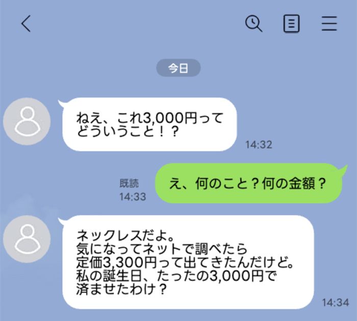 彼女:「ネックレスだよ。気になってネットで調べたら、定価3,300円って出てきたんだけど。私の誕生日、たったの3,000円で済ませたわけ?」