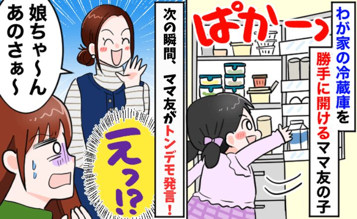 私はびっくりしながらも「冷蔵庫は勝手に開けちゃダメだぞ〜」と冗談っぽく注意しました。それでもママ友は笑っているだけ……。