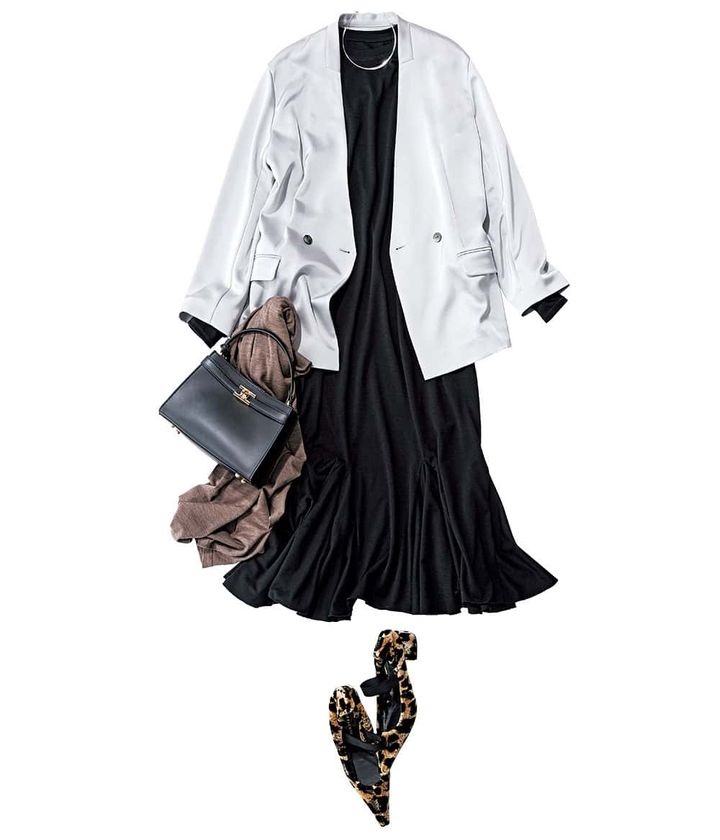 最もシャープで大人な顔は、ほぼクロの冷たさや寂しい印象の払拭が鍵。ゴージャスになりすぎないシルバーJKと裾フレアワンピースで、怖くない華やぎに。