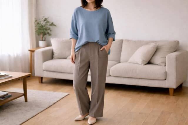 トップスをそのままアウトで着るスタイルは体型を隠せる反面、縦のラインが途中で分断されやすく、ウエスト位置が曖昧になりがちです。