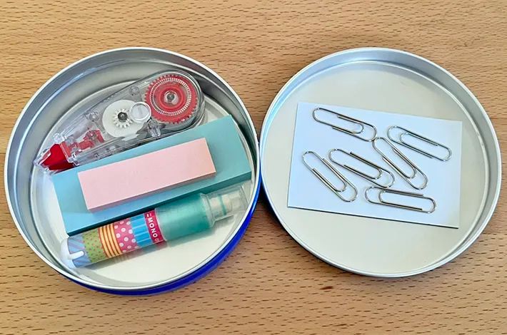 筆者が使った、169gの大きめサイズの缶なら、付箋や修正テープなどを収納できますよ。