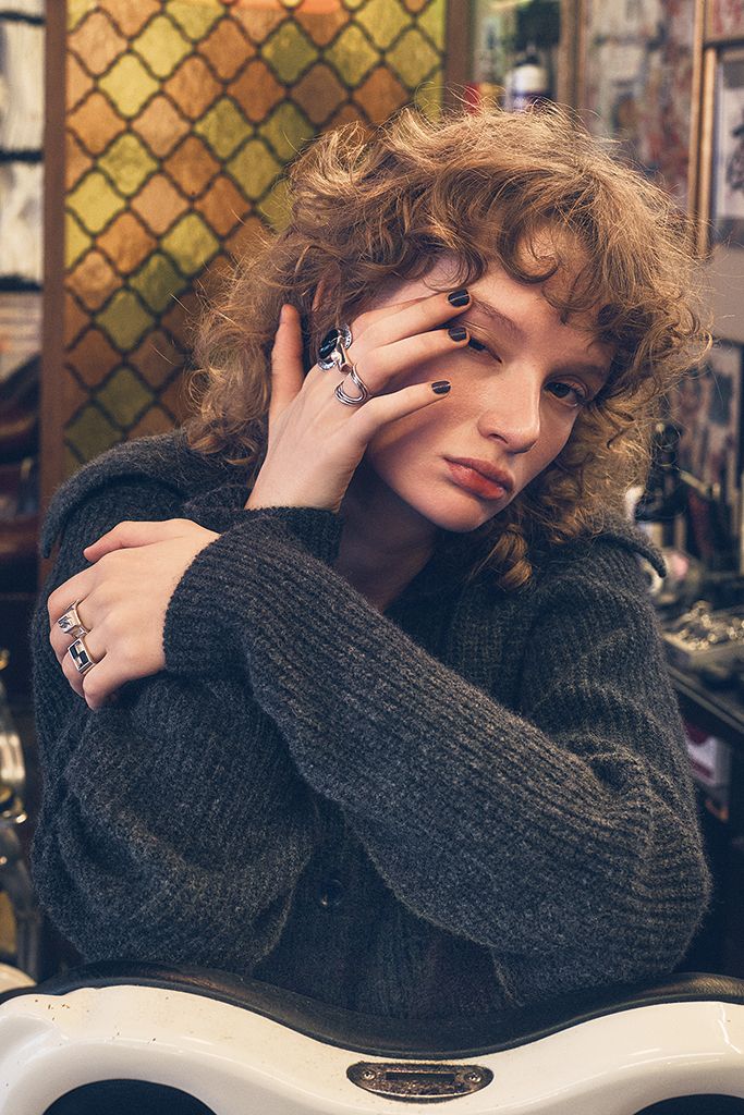 〈右手・人さし指〉黒ストーンリング/アダワット トゥアレグ(ザ エディット ストア) 〈右手・中指〉パールスクエアリング/Valentine 〈右手・薬指〉リング/IRIS 47(フーブス) 〈左手・中指〉レタードリング、〈薬指〉リング/ともにValentine えりつきニットカーディガン/HER.