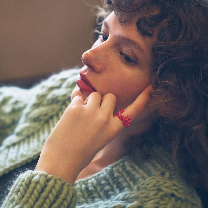 つややかなエナメルリングには、“hottie(魅力的な人)”との文字が。ロージーモーヴのリップとともに彩れば、穏やかなミントカラーのニットにもさりげない強さが生まれ、センシュアルに。 リップは。色ムラができにくいテクスチャーで、重ねづけの回数で表情がさらに変化。