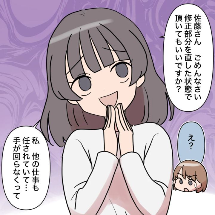 すると田中さんは両手を合わせ、「佐藤さんごめんなさい、修正部分を直した状態で頂いてもいいですか?」と頼んできました。思いもよらないお願いに、私は思わず「え?」と声を漏らします。「私、他の仕事も任されていて・・・手が回らなくって」どうして私が田中さんの仕事までやらなきゃいけないの?