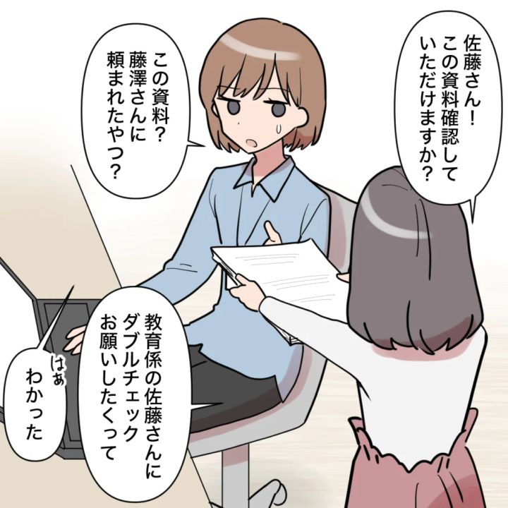 翌日、田中さんへの不信感と和真への怒りを抱えたまま出社した私。すると田中さんから「佐藤さん、この資料を確認していただけますか?」と声をかけられました。どうやら教育係である私に、藤澤さんから依頼された資料のダブルチェックを頼みたいようです。私は「わかった」と返事をして資料を受け取りました。