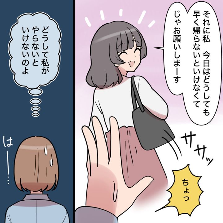 私が資料を返そうとした瞬間、田中さんはさっと立ち上がり、「それに私、今日はどうしても早く帰らないといけなくて、じゃあお願いしまーす」と笑顔で去っていきました。どうして私がやらないといけないの。他の仕事もまかされていて手が回らないのに、なんで人に残業させて、自分は定時で帰っていくのよ。私は納得がいかないまま、渋々資料の修正に取りかかったのでした。