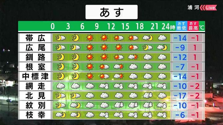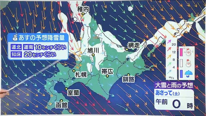 道東は晴れる見込みです。オホーツク海側の海岸部は昼頃から雪が降り、ふぶく時間があるでしょう。知床半島で20センチ近い雪が降りそうです。