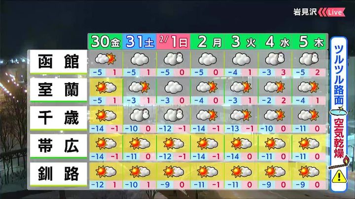 土日は千歳で雪の降る時間がありますが、大雪になる可能性は低いでしょう。東部は晴れて、空気が乾燥します。最高気温は0度前後です。ツルツル路面に注意して下さい。