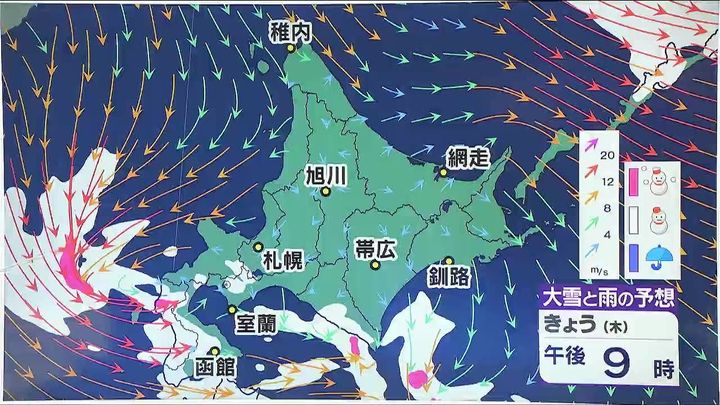 この冬は低気圧の影響を受けやすく、局地的な大雪になることが多くなっています。今夜9時の雪と風の予想は、道南方面で雪の降りやすい状態が続きます。矢印は風で渡島半島で矢印が渦状になっています。