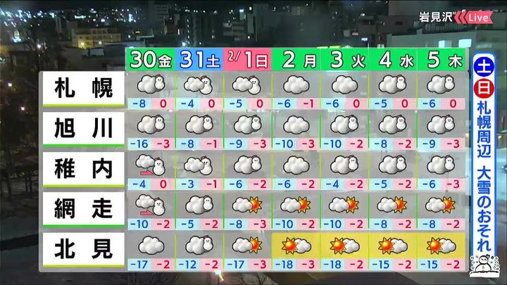 土日は各地で雪が降ります。特に札幌周辺で土曜は10~20センチ、日曜も20センチ前後の雪が降り、土日のトータルで30センチ以上に達するおそれがあります。
