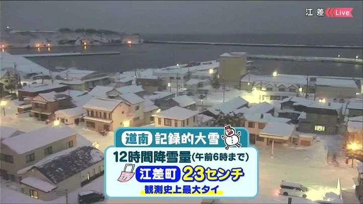 江差町では、きょう29日(木)午前6時までの12時間(ひと晩)で観測史上最大となる23センチの雪が降りました。