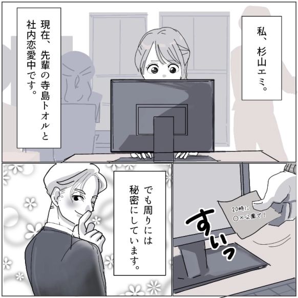 先輩社員のトオルと社内恋愛中のエミ。周りには秘密にしているため、アイコンタクトをこっそり取ったり、時間をずらして外で待ち合わせをして一緒に帰ったりなど、関係がバレないように工夫していた。