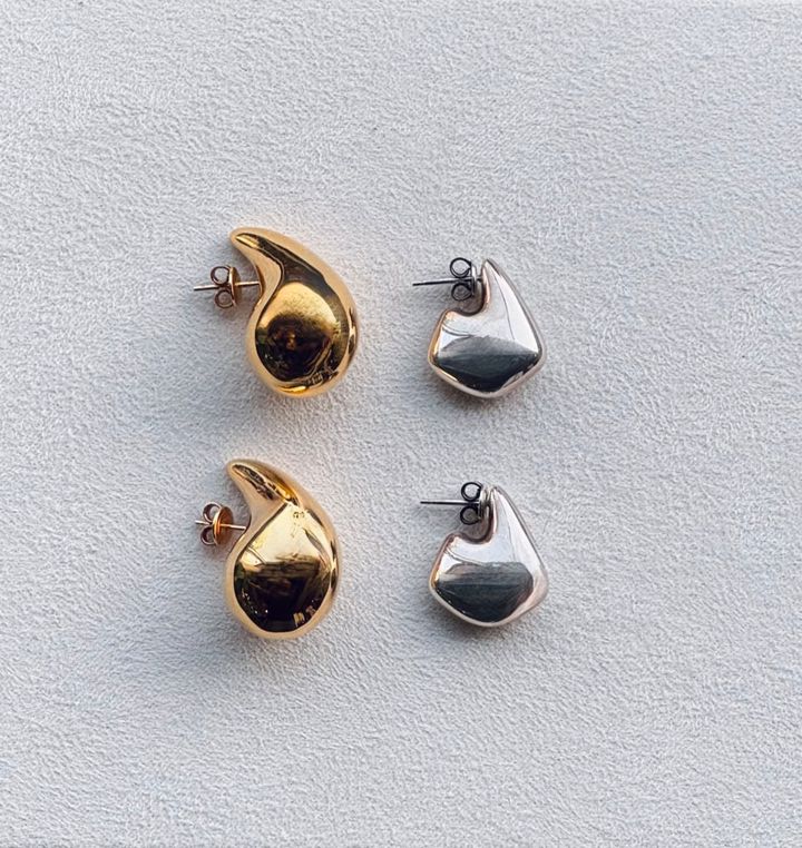コロンとしたフォルムが可愛い。見た目のボリュームに反して本当に軽い! スモールドロップピアスは約¥100,000くらいで購入。